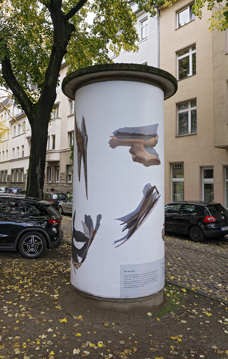 Im laufenden Jahr konnten Kölner Bürger*innen eine ganze Reihe von künstlerischen Motiven auf den Kunstsäulen entdecken, die sich in verschiedenen Stadtbezirken von Köln an gut einsehbaren und viel frequentierten Orten befinden. Sie stammten von den Künstler*innen Ruth Weigand ("The river runs"), Boris Becker ("Druckzentrum Köln Niehl"), Byron Co ("Zeitkapsel") und Lisa Mayer & Emil Adam ("Abandoned Toys"). Seit Kurzem ist das Motiv von Céline Berger "Communal thread" zu sehen, ab Mitte Oktober folgt die Arbeit "I dreamt of growing up queer in a free Iran" von Hanieh Bozorgnia. Zum Jahreswechsel ist das Motiv "Empty your mind" von Lenia Friedrich zu sehen.