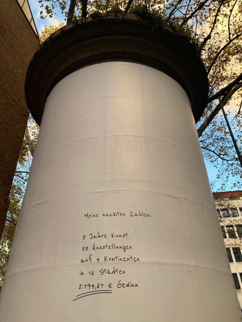 Die erfolgreiche Kunstaktion "Kunst an Kölner Litfaßsäulen" wird mit einem neuen, ungewöhnlichen und hoch aktuellen Motiv weitergeführt. Dawid Liftinger ist der Künstler, der seine Einkünfte, sein finanzielles Dasein, offenlegt und diese Zahlen auf den 25 Litfaßsäulen den Betrachterinnen und Betrachtern zugänglich macht.