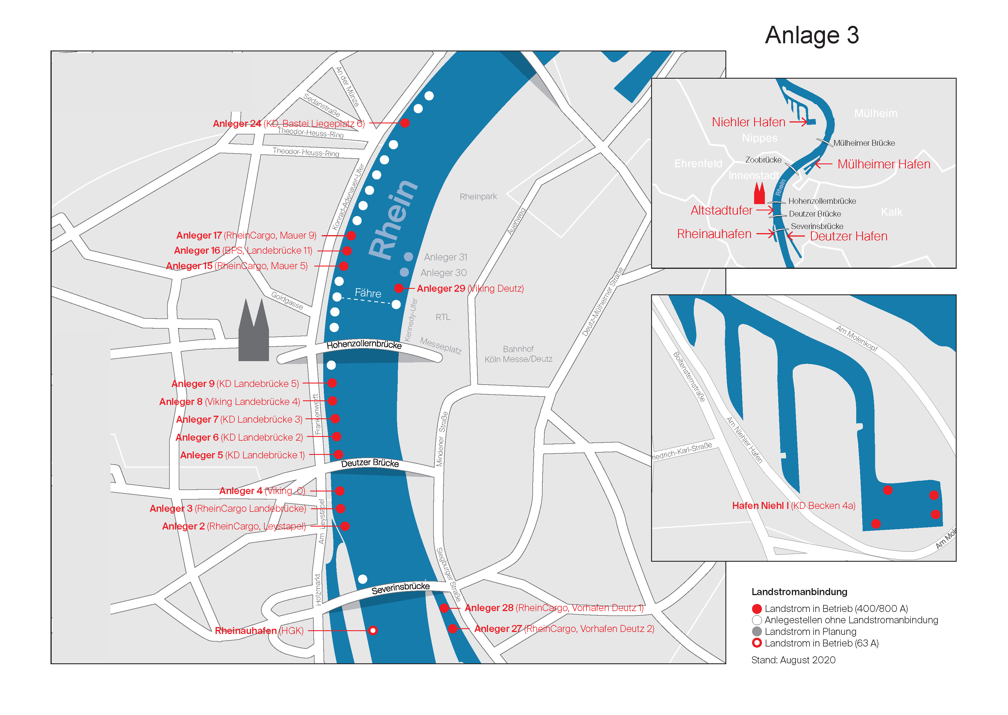 Bis Ende 2020 konnten insgesamt 16 Landstromversorgungsanlagen durch die Stadtwerke Köln GmbH (SWK) erstellt werden. Insbesondere auch im Stadtbezirk Mülheim ist ein weiterer Ausbau vorgesehen. Die Stadt wird in einem ersten Schritt mit der SWK über die Landstromversorgung an zwei auf städtischem Grundstück befindlichen Anlegestellen im Stadtbezirk Mülheim sprechen
