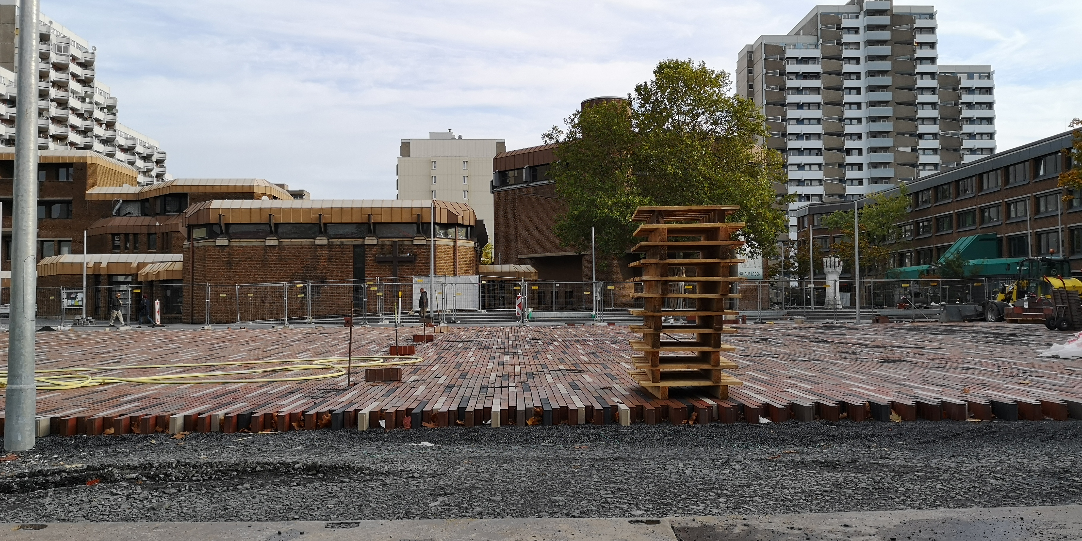 Die Umgestaltung der drei zentralen Plätze im Stadtteil Köln-Chorweiler geht weiter voran. Noch im Frühjahr prägten Abrissarbeiten und großflächige Schotterflächen das Bild. Inzwischen sind die Pflasterflächen sowie Treppenstufen und Sitzmauern zum großen Teil fertiggestellt. Anfang dieses Jahres starteten die Bauarbeiten für dieses mit Bundesmitteln geförderte Vorhaben unter dem Titel "Lebenswertes Chorweiler".