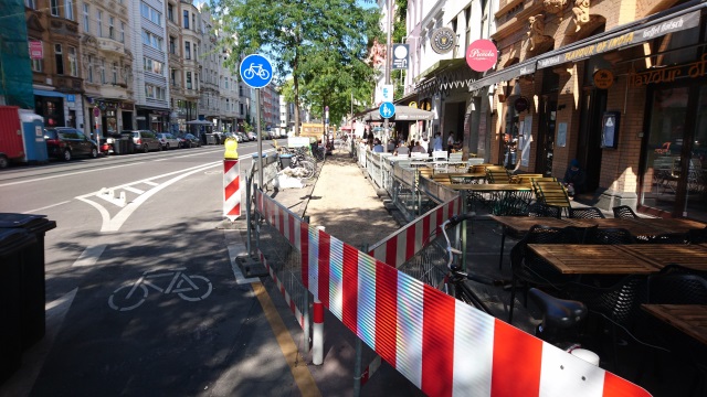 In dieser Woche hat die Stadt Köln damit begonnen, das alte Radwegpflaster durch Gehwegplatten zu ersetzen. Das Amt für öffentliche Ordnung arbeitet parallel an einem Konzept zur Neuordnung der Außengastronomie im oben genannten Abschnitt.