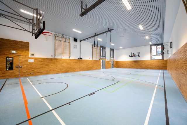 Entstanden ist nun ein vom Innenhof aus erschlossenes Gebäudeensemble mit vier Erweiterungsbauten, die sich in die Bestandsarchitektur einfügen. Neben den erforderlichen Unterrichtsräumen sind Verwaltungsräume, einige Mehrzweckräume beispielsweise für die Arbeit in kleineren Gruppen, eine Bibliothek, eine Großküche mit Speiseraum sowie neue Umkleideräume für die Gymnastikhalle entstanden. Mit Ausnahme des dreigeschossigen Verwaltungstrakts sind die Erweiterungsbauten zweigeschossig und wurden mit Photovoltaikanlagen ausgestattet. Sie sind barrierefrei an das bestehende Schulhauptgebäude angebunden. Auch der Pausenhof und die Außenanlagen wurden neu gestaltet.
