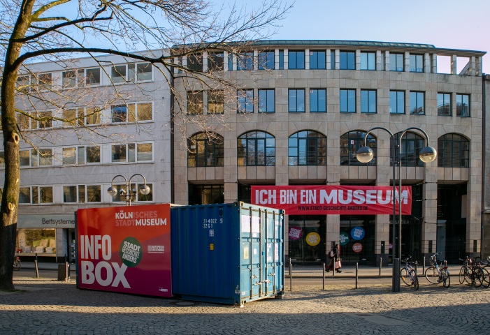 Ein erstes Beispiel für das gewandelte äußere Erscheinungsbild des Hauses ist eine "Museums-Infobox", die am 14. März 2022 auf dem Kolpingplatz eröffnet wurde. In diesem auffällig gestalteten Container informiert das Museumsteam über den aktuellen Stand des Umbaus und die Neukonzeption des Hauses. Kurze Filme und Interviews sowie großformatige Visualisierungen geben einen spannenden Vorgeschmack auf die entstehende Dauerausstellung. Bei einem Gewinnspiel können die Besucher*innen zudem exklusive Führungen gewinnen und so das neugestaltete Haus noch vor der offiziellen Eröffnung kennenlernen. Die "Infobox" ist montags bis samstags von 12 bis 18 Uhr geöffnet.