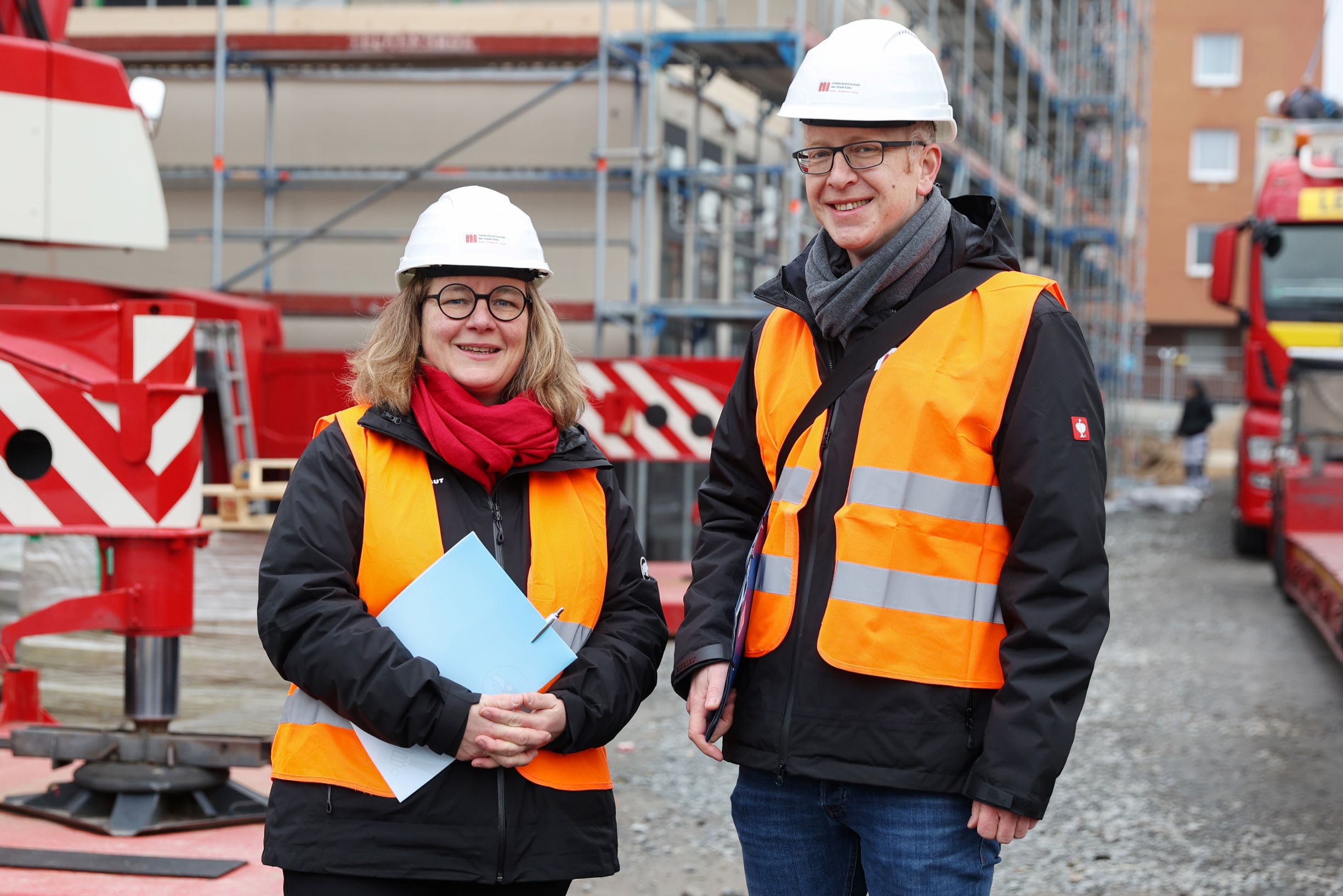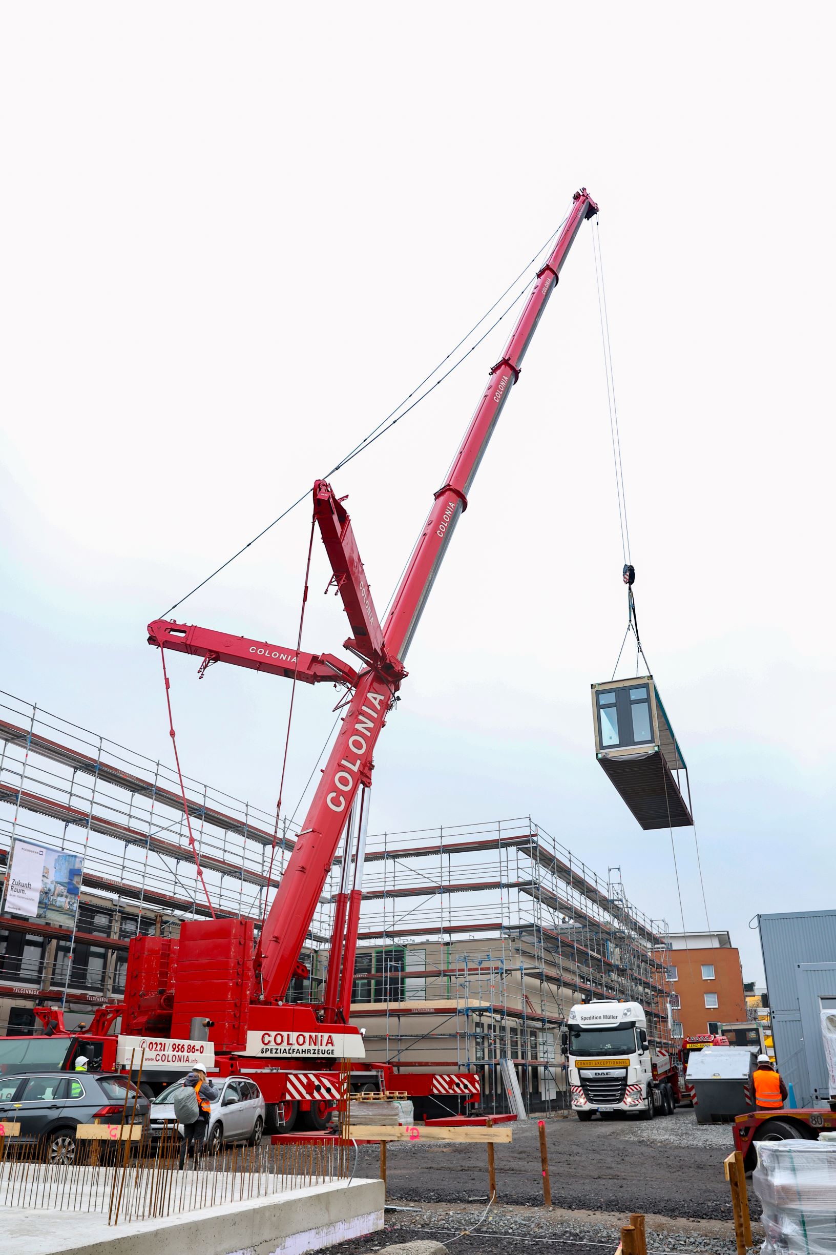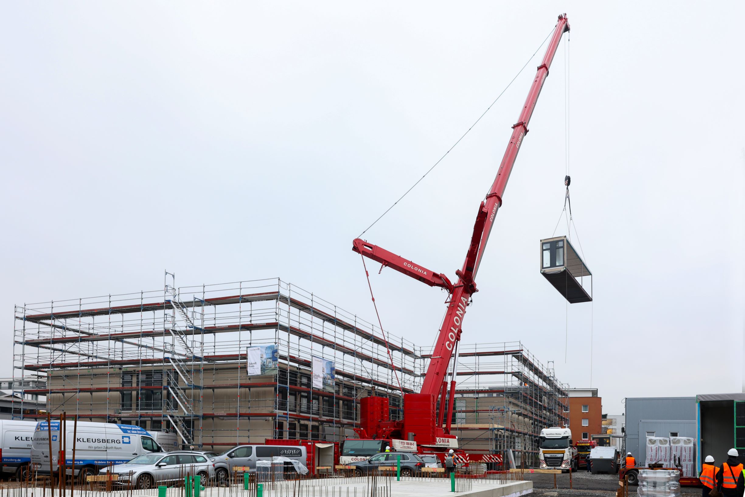 Die ersten von insgesamt 154 Modulbau-Elementen zur Errichtung einer neuen Grundschule sind an der Vietorstraße89/Thessaloniki-Allee in Kalk eingetroffen und durch das Modulbau-Unternehmen Kleusberg montiert. Und täglich kommen weitere acht bis zehn Module hinzu. Die erste von drei Etagen ist bereits komplett errichtet. Und im 45-Minuten-Ryhtmus fährt jeweils die nächste Sattelzugmaschine mit Flachbett samt Ladung auf das Baufeld. Die Transporte erfolgen teils nachts und von der Polizei eskortiert in Konvois als Sondertransporte von ihrer Produktionsstätte in Kabelsketal-Dölbau bei Leipzig bis nach Köln.