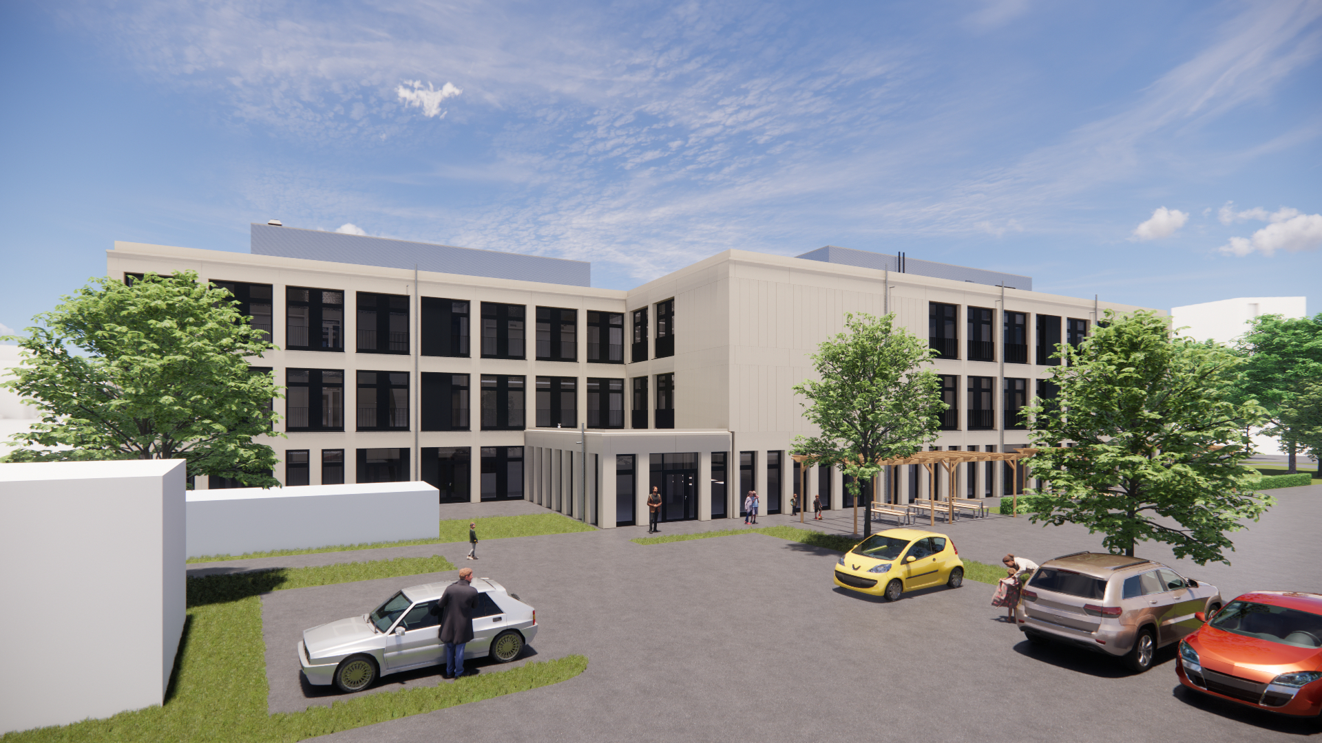 Anders als bei der Errichtung temporärer Container, handelt es sich beim Modulbau um eine Art Fertighausprinzip. Es geht dabei um eine hochwertige Bauweise, konzipiert und produziert für eine lange Standzeit. Alle drei Bauten mit Nebenbauten werden in Modulbauweise und nach Passivhausstandard errichtet, was gleichermaßen klima- wie nutzerfreundlich ist und Betriebskosten spart. Realisiert wird jeweils ein Schulgebäude mit Mensa, die auch über eine Terrasse mit Außensitzplätzen verfügt. Die Eingangshalle wird als Versammlungsstätte für schulische Veranstaltungen konzipiert. Das Gebäudevolumen wird so gestaffelt, dass die Maßstäblichkeit der umgebenden Bebauung aufgenommen wird. Die Sporthallen werden jeweils als solitärer Baukörper in das Schulensemble integriert. Im Außenbereich sind Bäume als Schattenspender und Spielangebote für die Grundschüler*innen geplant.