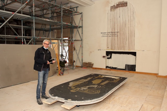 Jedes der Bilder ist 680 bis 750 Kilogramm schwer. Das erste der sieben Wandbilder wurde vor wenigen Tagen in enger Abstimmung mit dem Amt für Denkmalschutz und Denkmalpflege geborgen und ausgebaut. Dazu musste zunächst sehr behutsam die Vermauerung auf der Rückseite, die als Träger diente, bis auf eine Putzdicke soweit zurückgebaut werden, bis das Putzsystem nur noch drei bis vier Zentimeter stark war.