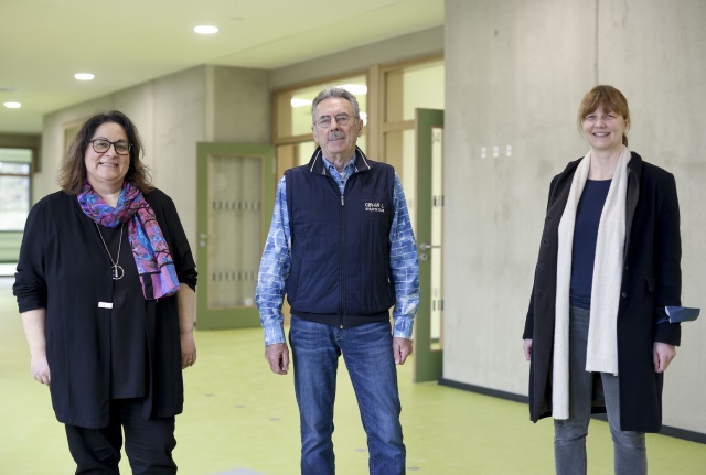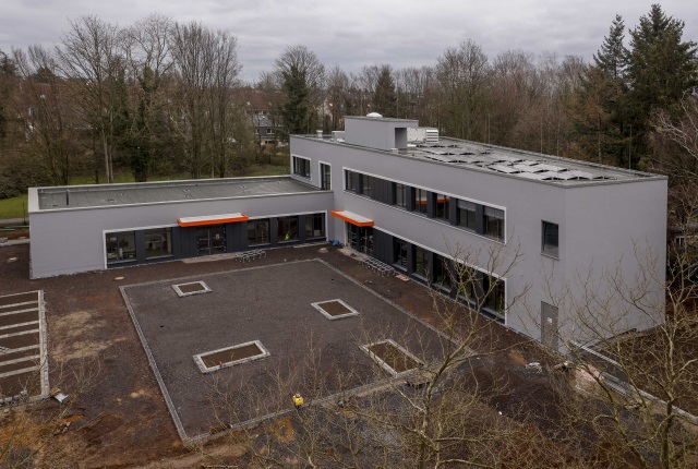 Das neue Gebäude wurde massiv und in Anlehnung an den Passivhausstandard erstellt. Optisch passt es sich mit seiner grauen Putzfassade an die bereits vorhandenen Schulgebäude an. In dem zweigeschossigen neuen Gebäudeteil werden die Unterrichtsbereiche für die Sekundarstufe II untergebracht, im eingeschossigen Teil entsteht der Ganztagsbereich. Die Bruttogrundfläche für den neuen Baukörper beträgt rund 2.200 Quadratmeter, davon befinden sich etwa 600 Quadratmeter auf dem Dach, wo neben der Lüftungseinrichtung auch eine Photovoltaik-Anlage installiert wurde, die einen Beitrag zur nachhaltigen Energiegewinnung leistet. Der Neubau wird Platz für rund 120 zusätzliche Schülerinnen und Schüler bieten.