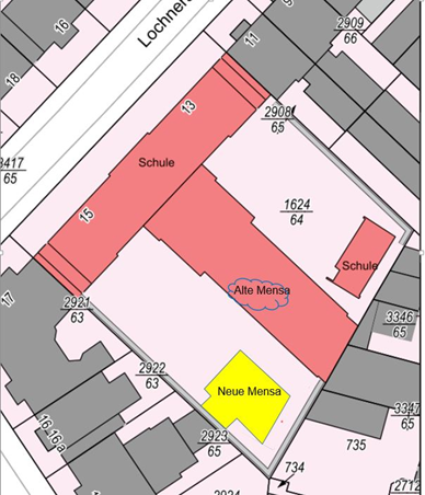 Die bisherige Mittagsversorgung im Erdgeschoss des rückwärtig liegenden Gebäudetrakts ist für die Anzahl der benötigten Essen nicht mehr ausreichend. Insbesondere die vorhandene Küche wird dem heutigen Anspruch nicht mehr gerecht. Weil in den vorhandenen Räumen der Offenen Ganztagsschule eine funktionierende Mensaküche mit angemessen großem Speisesaal nicht zu verwirklichen ist, werden die notwendigen, größeren Mensaräume künftig in einem Neubau auf dem südlichen Schulhofgelände untergebracht. Das neue, eingeschossige Gebäude mit Flachdach und begrünten Dachflächen ersetzt den bisherigen Klassenpavillon, der abgerissen wird. Der dadurch verlorene Unterrichtsraum wird durch die frei werdenden Räumlichkeiten der Bestandsmensa ausgeglichen. Ein heller Speiseraum mit großen Fenstern und rund 80 Sitzplätzen macht zukünftig eine Mittagsverpflegung in einem Drei-Schicht-Betrieb möglich.