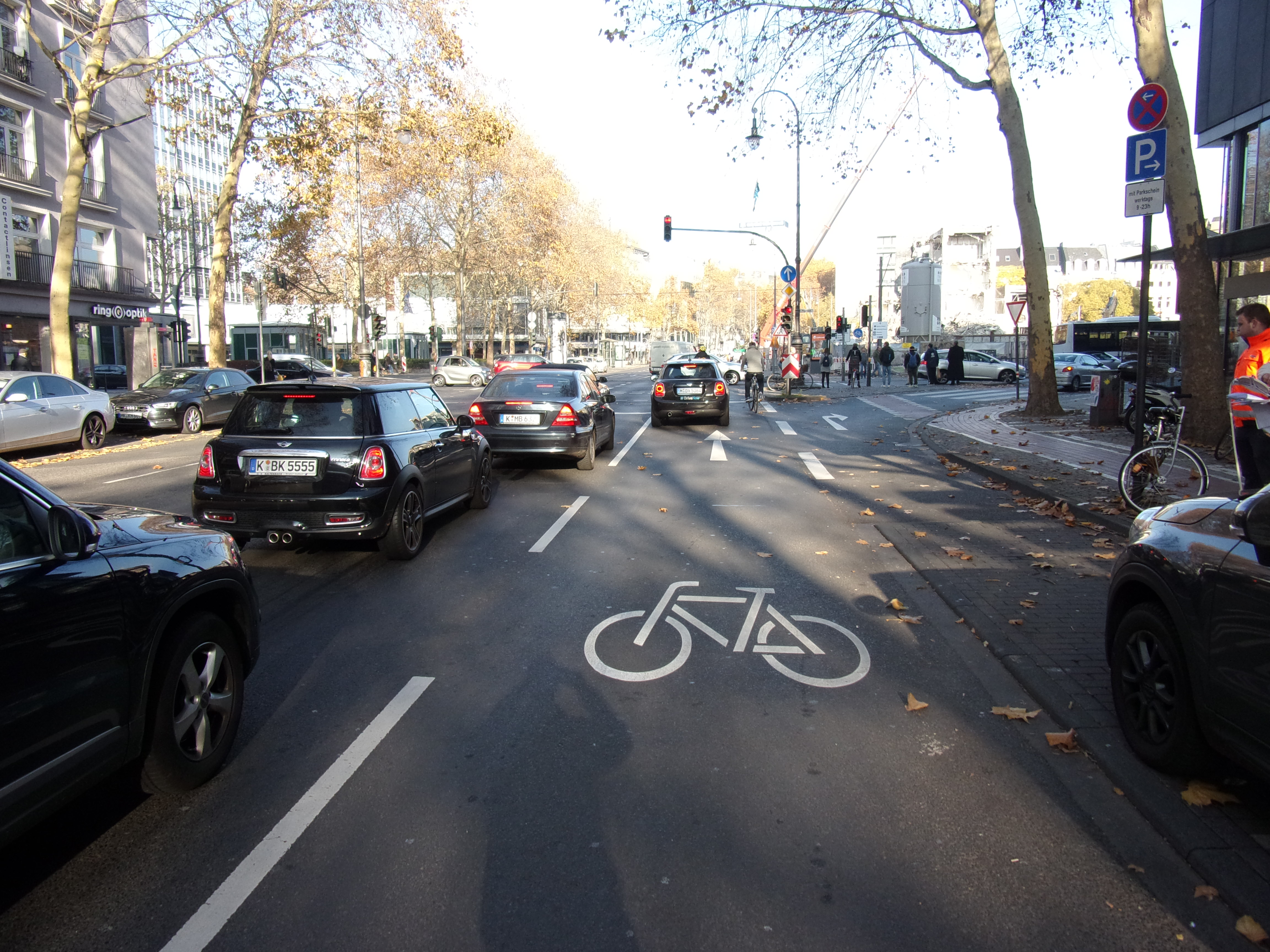 - Hinweis: In südlicher Fahrtrichtung soll im Zusammenhang mit der Fertigstellung der Baustelle und Neuordnung der Fahrstreifen am Rudolfplatz zu einem späteren Zeitpunkt die Fahrbahn in Richtung Lindenstraße verbreitert werden, um dann den Radfahrstreifen auch in südlicher Fahrtrichtung in Regelbreite fortzuführen.