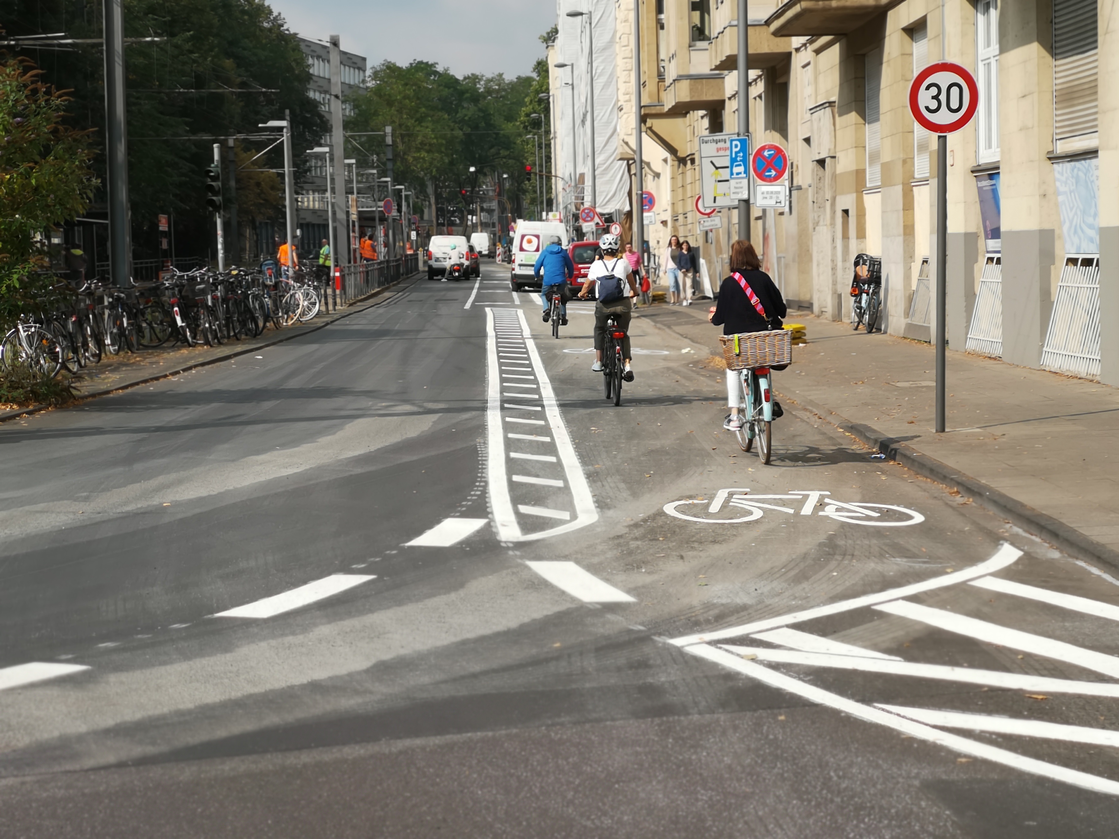 - Auf dem Ubierring wird bis zum Anschluss an den Bestand an der Alteburger Straße eine Autospur in eine Radspur umgewandelt, dabei wird überwiegend ein Radfahrstreifen markiert.