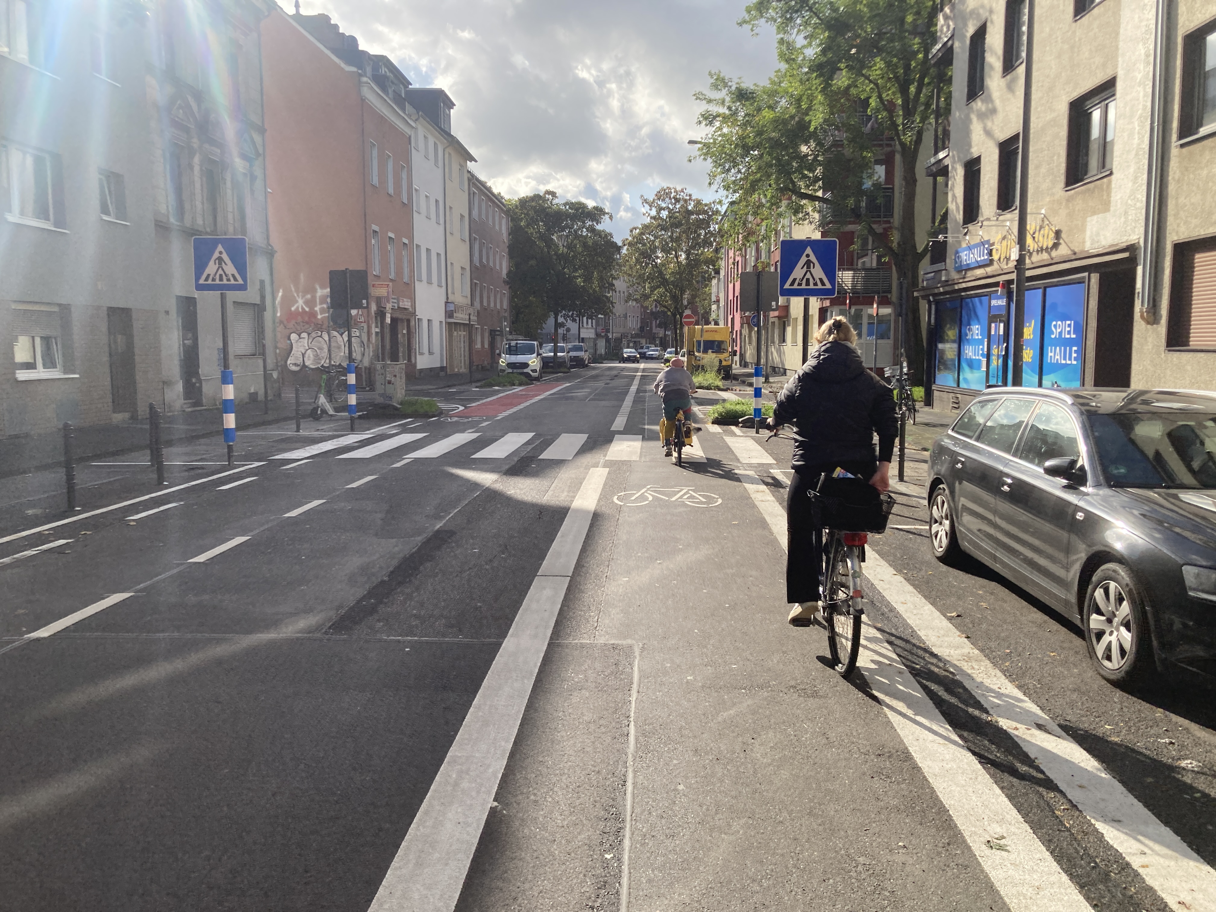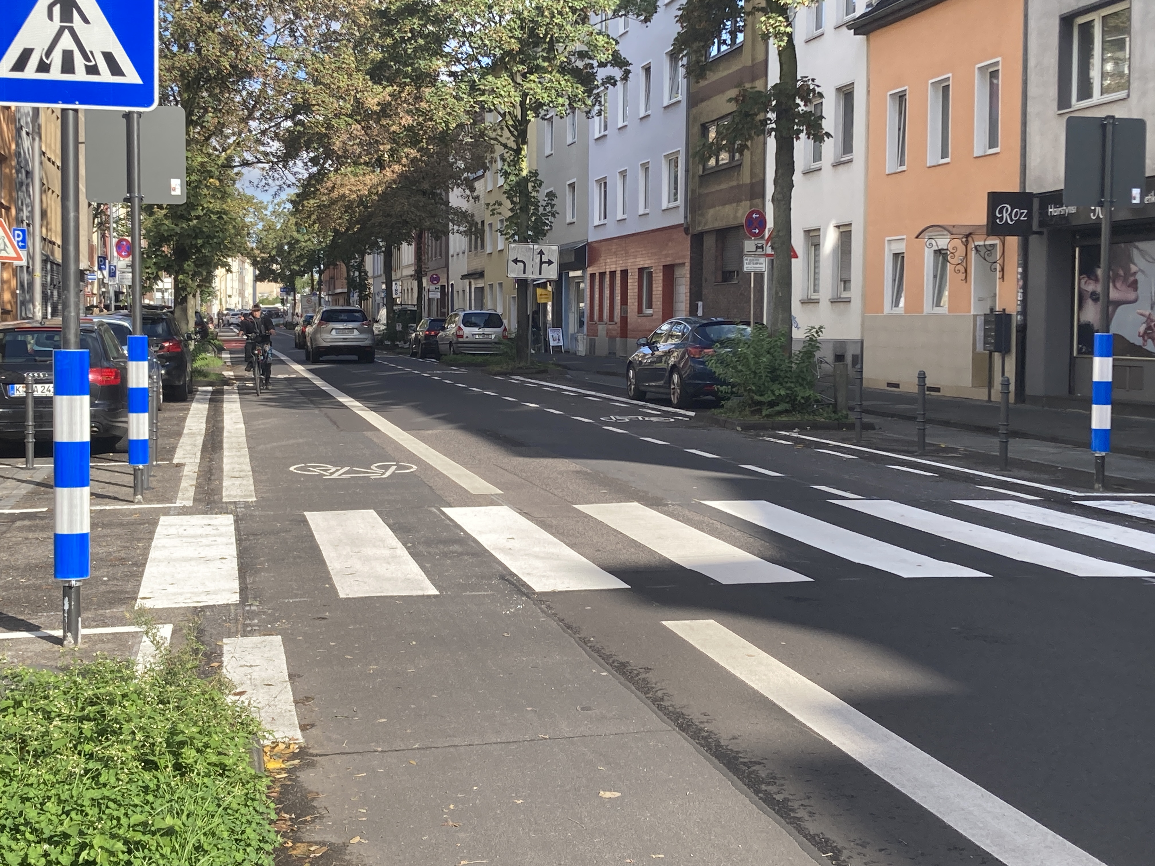 Nachdem im Frühjahr 2022 die Radverkehrsführung auf der Kalk-Mülheimer Straße zwischen Kalker Hauptstraße und Höfestraße auf einer Länge von 400 Metern optimiert wurde, wurde nun der nächste Abschnitt der Kalk-Mülheimer Straße für den Rad- und Fußverkehr deutlich verbessert: Auch zwischen Höfestraße und Wipperfürther Straße werden die Radfahrer*innen jetzt in beiden Fahrtrichtungen auf Schutz- beziehungsweise Radfahrstreifen auf der Fahrbahn geführt. Dadurch sind die Sichtbeziehungen zwischen Radfahrer*innen und Autofahrer*innen besser und die Radverkehrsanlagen breiter als bisher. Die verbleibende einspurige Fahrbahn ist durchgängig mindestens 2,75 Meter breit.