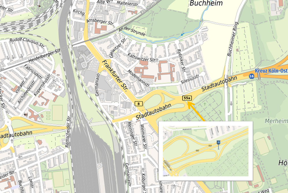 Der Unfallschwerpunkt auf der Stadtautobahn (B55a) zwischen der Auffahrt Buchforst und der Anschlussstelle Höhenberg in Fahrtrichtung Autobahnkreuz Köln-Ost (stadtauswärts) soll entschärft werden. Deshalb wird die Stadt Köln dort eine stationäre Blitzeranlage installieren. An der Stelle war es in der Vergangenheit zu mehreren zum Teil schweren Unfällen gekommen.