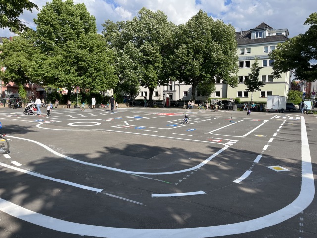 "Fahrradstraße, Einbahnstraße, Vorfahrt achten?" – auf dem Auerbachplatz in Köln-Sülz können die Verkehrsregeln jetzt spielerisch "erfahren" werden. Zwischen Euskirchener Straße, Rheinbacher Straße und Blankenheimer Straße hat die Stadt Köln einen Verkehrsübungsplatz eingerichtet.