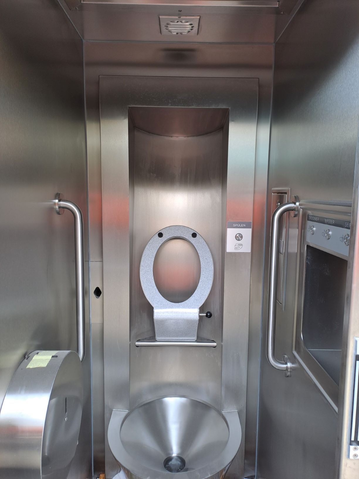 Um das Hocken ohne Kontakt zur WC-Schüssel zu erleichtern, sind seitliche Griffe angebracht. Ein Waschbecken mit Seife und Händetrockner sowie ein Abfallbehälter ergänzen die komplett aus Edelstahl gefertigte Innenausstattung. Die Toilette wird täglich von den AWB gereinigt. Öffentliche Toiletten desselben Typs folgen an weiteren Standorten im Lauf des Jahres.