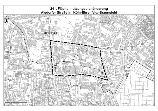 Der Stadtentwicklungsausschuss der Stadt Köln hat in seiner Sitzung am 17. Juni 2021 die frühzeitige Öffentlichkeitsbeteiligung zur Änderung des Flächennutzungsplans (FNP) unter dem Arbeitstitel "Alsdorfer Straße" beschlossen. Das rund 30 Hektar große Plangebiet erstreckt sich über die Stadtteile Ehrenfeld und Braunsfeld. Das künftig zu bebauende Gebiet wird im Norden von der Widdersdorfer Straße, im Osten von der Oskar-Jäger-Straße, im Süden Stolberger Straße und im Westen vom Maarweg begrenzt.
