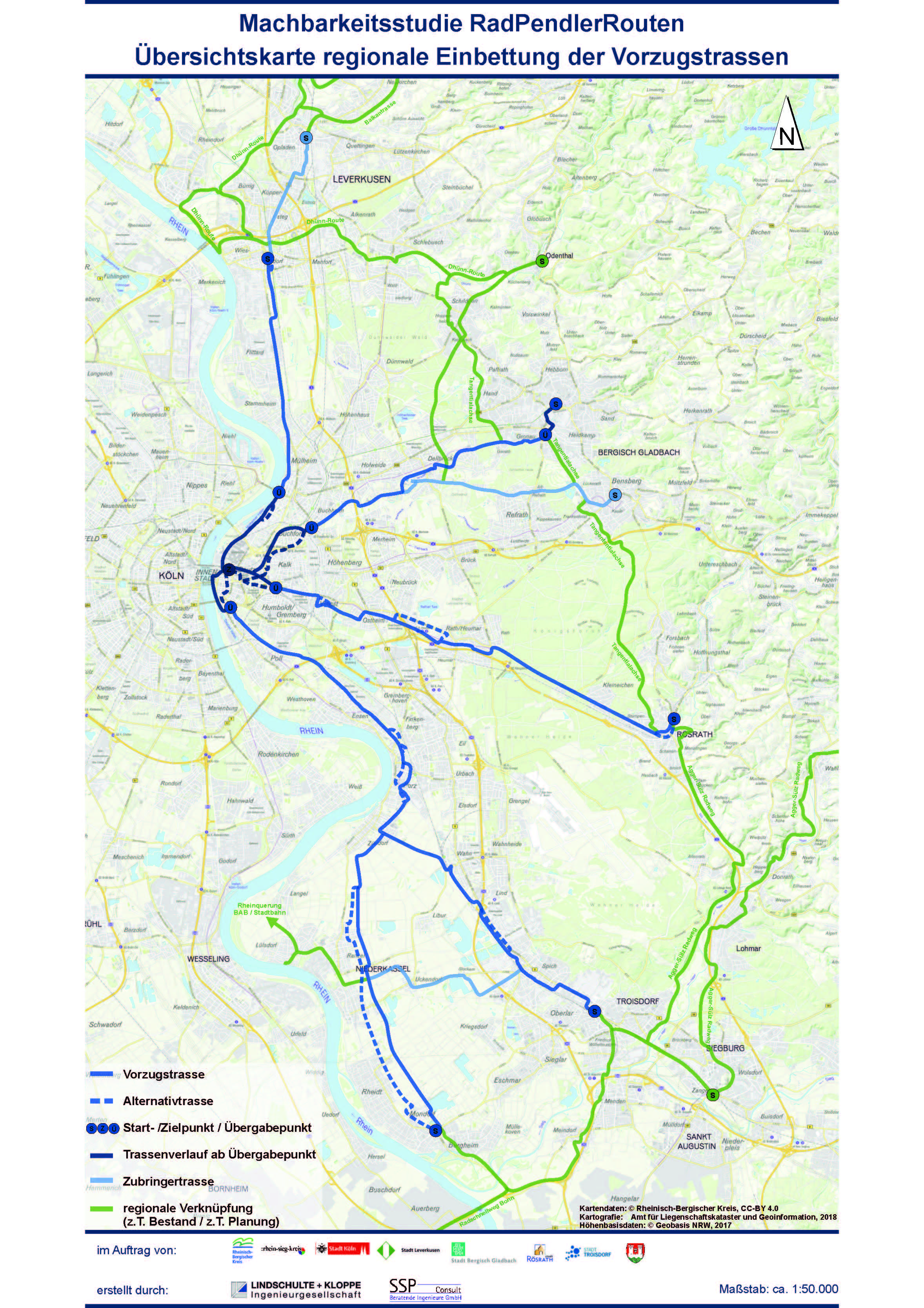 In der 2019 fertiggestellten Machbarkeitsstudie wurden vier Trassen definiert, die aus dem rechtsrheinischen Köln nach Leverkusen, Bergisch Gladbach, Rösrath und Lohmar sowie Troisdorf und Niederkassel mit Anbindung an den öffentlichen Personennahverkehr führen. Die Hauptachsen der "RadPendlerRouten" haben eine Gesamtlänge von rund 80 Kilometern und sollen in Zukunft durch Zubringerrouten ergänzt werden, sodass ein zusammenhängendes Radwegenetz entsteht. Im Rahmen der Machbarkeitsstudie wurde berechnet, dass durch die "RadPendlerRouten" täglich auf den Trassen Leverkusen/Köln rund 1.500, Bergisch Gladbach/ Köln rund 2.200, Rösrath/Köln rund 2.300, Troisdorf/Köln 4.500 sowie Niederkassel/Köln 3.800 Fahrradfahrerinnen und -fahrer mehr unterwegs sein könnten, als dies bisher der Fall ist.