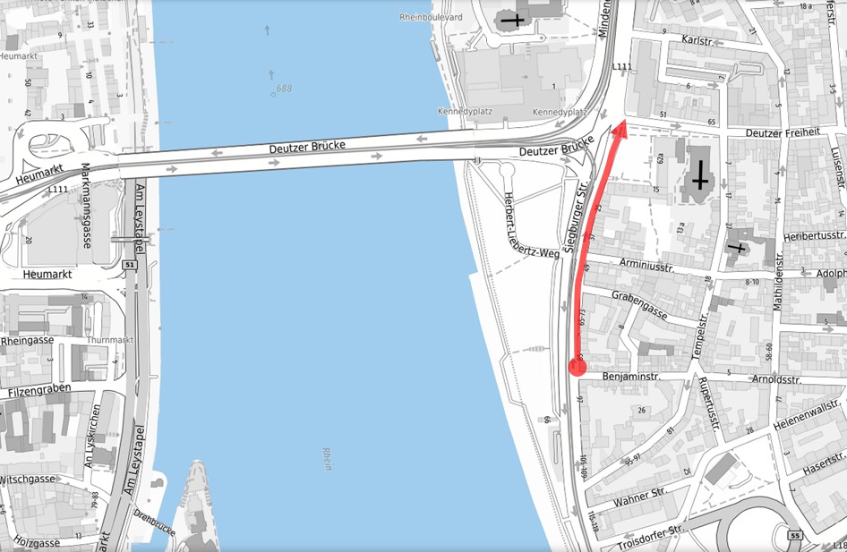 Auf der Grundlage des Radverkehrskonzepts Innenstadt sollen mit der Einrichtung eines 2,50 Meter breiten Radfahrstreifens anstelle der rechten Kfz-Fahrspur auf der Siegburger Straße gleich mehrere Stellen für den Rad- und Fußverkehr verbessert werden. Ausgangspunkt für diese Maßnahme ist die derzeitige Radverkehrsführung zwischen der Südseite der Deutzer Brücke und der Deutzer Freiheit: Nach Überquerung der Siegburger Straße müssen sich Radfahrende hier die schmale Wegeführung im Zweirichtungsverkehr mit Fußgänger*innen teilen. Dadurch kommt es immer wieder zu Konflikten zwischen Radfahrenden untereinander und mit Fußgänger*innen, die auf ihrem Weg zur KVB-Haltestelle „Deutzer Freiheit“ die Siegburger Straße überqueren. Die Querung der Deutzer Freiheit soll deshalb optimiert und die Flächen für Fußgänger*innen erweitert werden. Mit einer entsprechenden Vorlage der Verwaltung werden sich nun die zuständigen Ausschüsse beschäftigen.