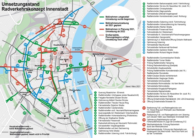 Mit der Umsetzung des Radverkehrskonzepts wurde neben der Verbesserung der Bedingungen für den Radverkehr auch die verkehrstechnische Infrastruktur modernisiert. So wurden beziehungsweise werden alleine an den drei Straßenzügen Kölner Ringe sowie an den Achsen Magnus- und Christophstraße mehr als 20 Ampelanlagen erneuert.