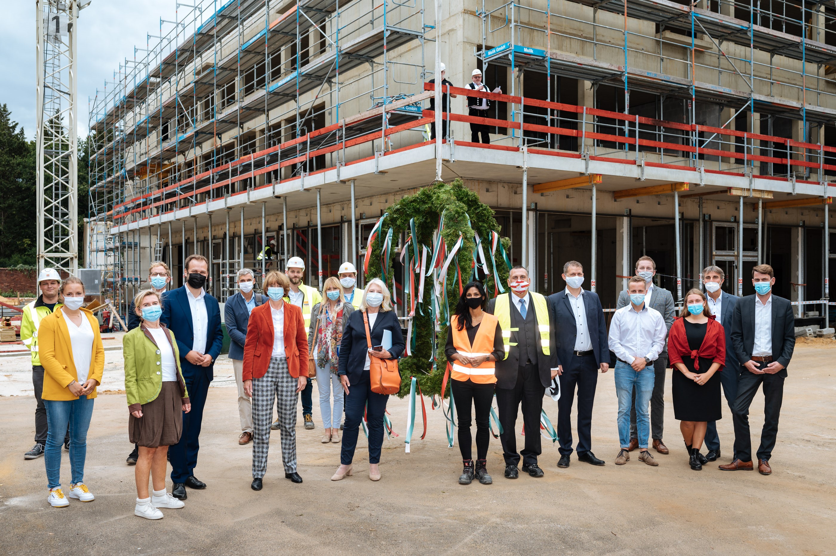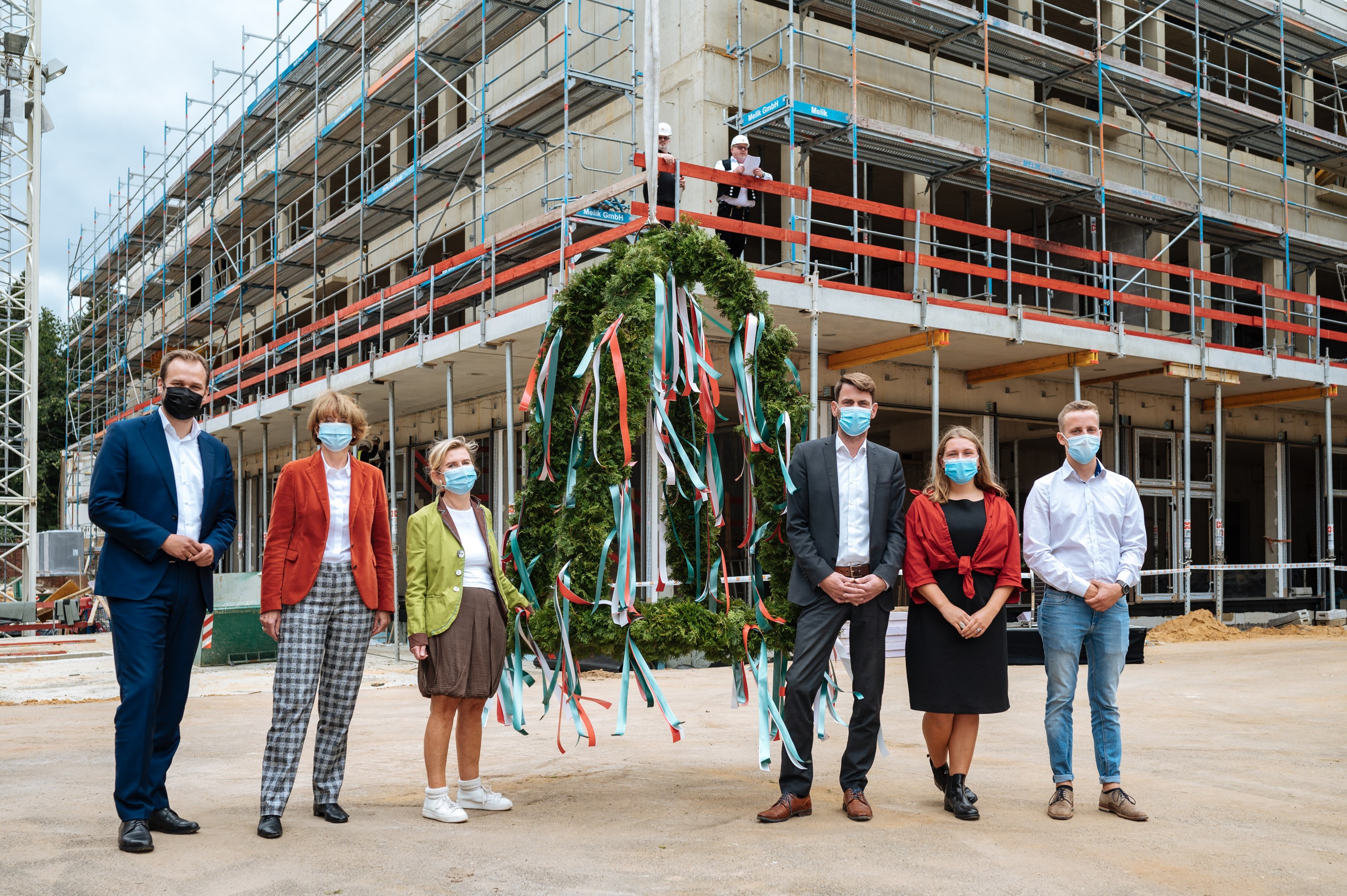 Seit dem heutigen Mittwoch, 9. September 2020, kann auf der Schulbaustelle in Köln-Sülz die mit bunten Bändern geschmückte Richtkrone für den Erweiterungsbau des Hildegard-von-Bingen-Gymnasiums bestaunt werden. Oberbürgermeisterin Henriette Reker hatte im November 2019 den Grundstein für die Schulerweiterung gesetzt und begrüßte nun auf der Baustelle Vertreter der Schulgemeinde, der am Bau beteiligten Unternehmen und Büros und von Politik und Verwaltung zu einem kleinen Richtfest.