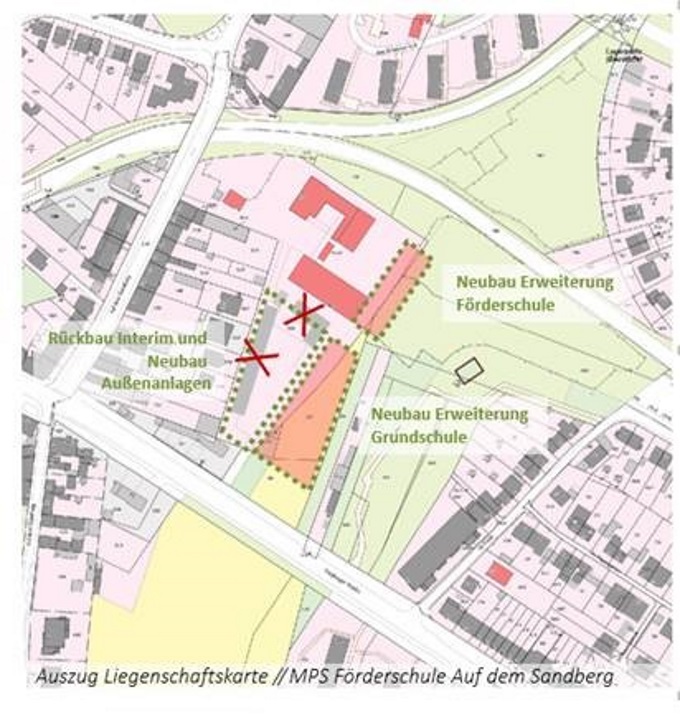 Die städtische Förderschule Auf dem Sandberg 120 mit dem Schwerpunkt geistige Entwicklung erhält einen Erweiterungsbau mit direkter baulicher Anbindung an das bestehende Schulgebäude. Auch die Außenanlagen werden neu gestaltet. Der Zugang zum dreigeschossigen Erweiterungsneubau erfolgt sowohl über einen neugeschaffenen Nebeneingang im Innenhof als auch über eine direkte bauliche Verbindung zum Bestandshauptgebäude in den beiden Obergeschossen.