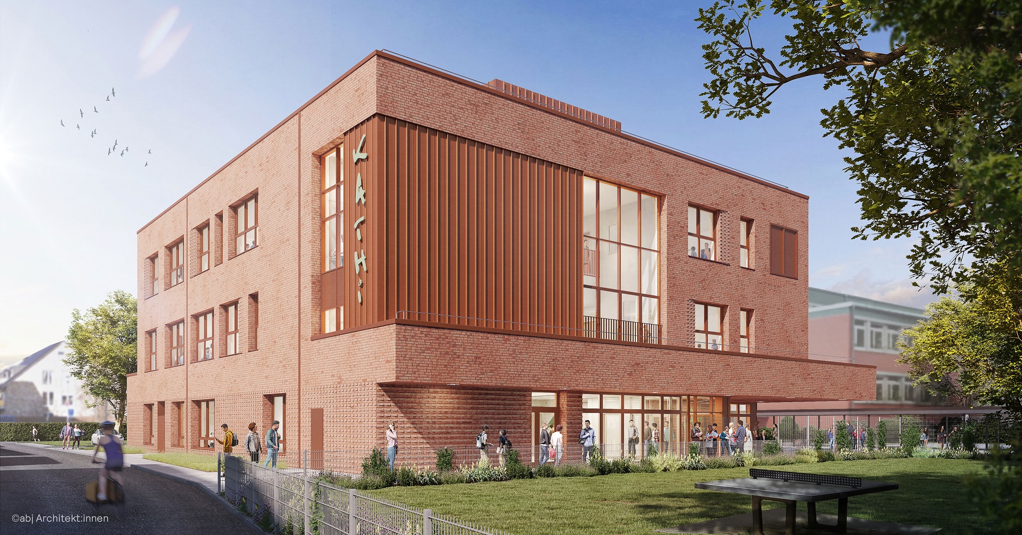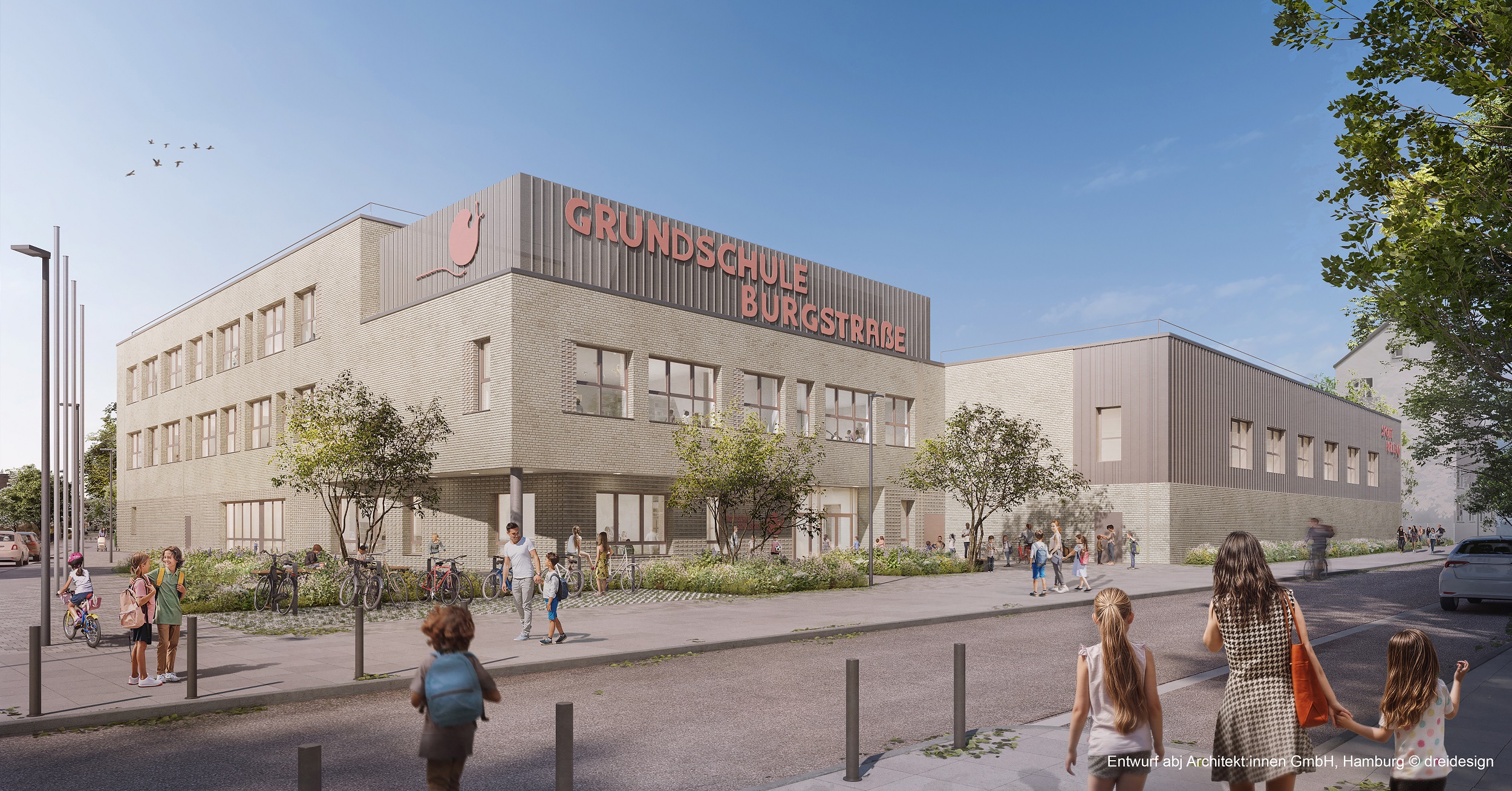 An die Stelle dieses Altbaus soll – voraussichtlich Anfang des zweiten Quartals 2026 – der Rohbau für ein neues, L-förmiges Gebäude für eine zweizügige Grundschule mit Mensa und einer Zweifachturnhalle beginnen. Optisch wird sich dieser Neubau mit einer weiß-beigen Fassade bewusst von der roten Klinkerfassade der benachbarten Gesamtschule abheben. Vor dem Haupteingang an der Ecke Burgstraße/Schulstraße wird ein kleiner, öffentlicher Vorplatz entstehen.