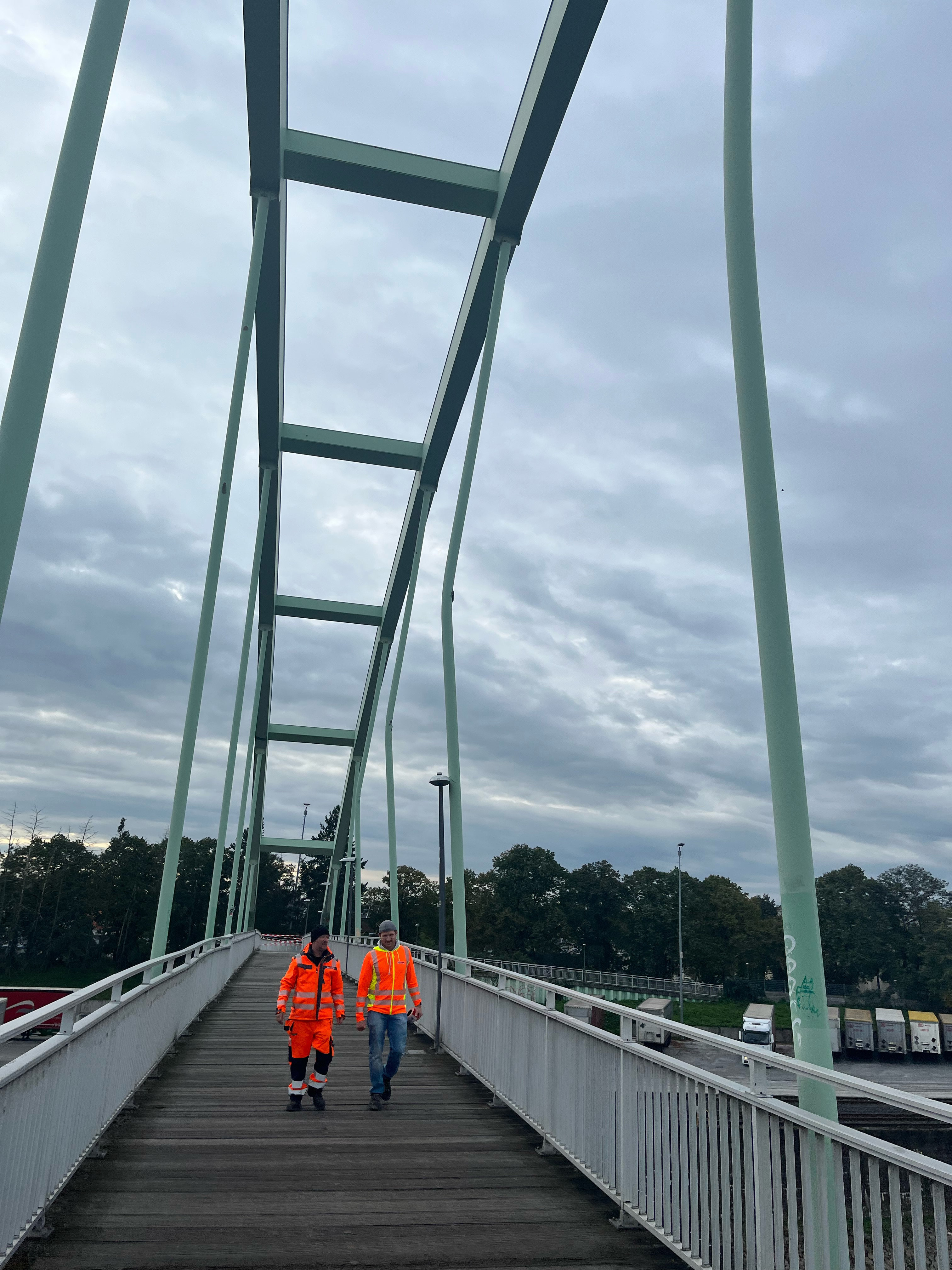 Bei der Einfahrt in den Hafen hat ein Schiff mit aufgestelltem Kran den Brückenüberbau erheblich beschädigt. Wesentliche Teile der Tragkonstruktion, beispielsweise Hauptträger, Querträger und Hänger, unterliegen erheblichen Verformungen. Aus diesem Grund muss der Fuß- und Radweg gesperrt werden. Die Umleitungsbeschilderung ist veranlasst und wird ab Donnerstag aufgebaut.