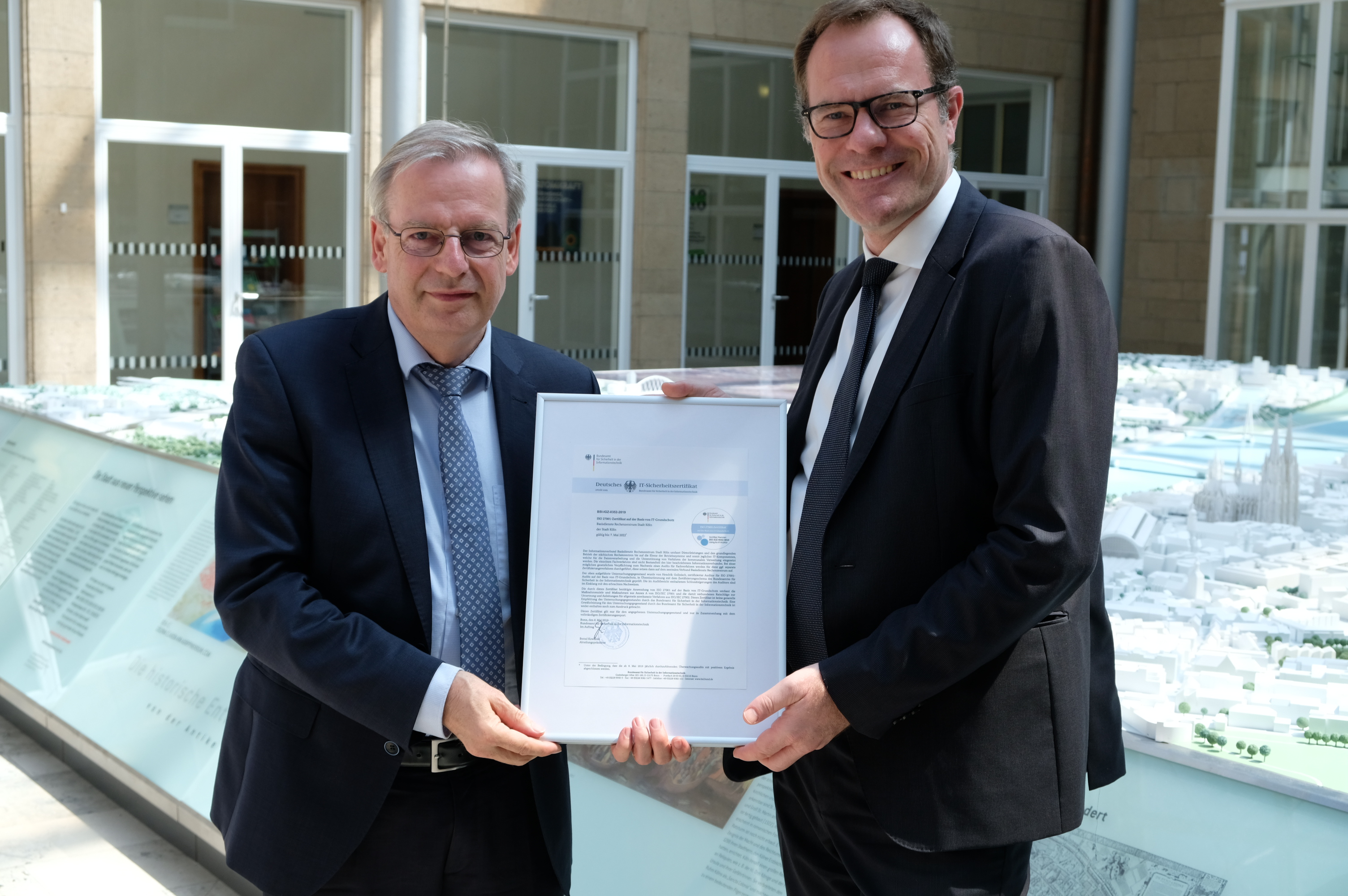 Der im Bundesamt für Sicherheit in der Informationstechnik (BSI) für Standardisierung und Zertifizierung zuständige Abteilungspräsident, Bernd Kowalski, hat Stadtdirektor Dr. Stephan Keller am Donnerstag, 4. Juli 2019, das Zertifikat nach der Norm ISO27001 auf Basis des IT-Grundschutzes überreicht. Dies ist die derzeit umfangreichste Zertifizierungsmöglichkeit für die Sicherheit eines IT-Betriebes. Als bundesweit erste kreisfreie Stadt mit integriertem IT-Dienstleister hat das IT-Amt der Stadt Köln damit diese Zertifizierung erhalten.