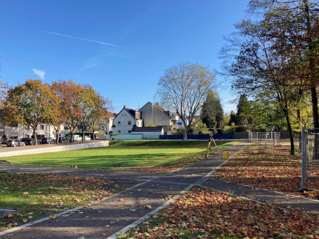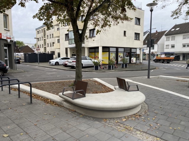 Der Platz an der Leidenhausener Straße wurde zu einem Quartiersplatz mit städtischem Charakter ausgebaut. Moderne Sitzelemente aus Beton umranden den vorhandenen Baumbestand und eine Schatten spendende Pergola säumt das Bild und sorgt für Aufenthaltsqualität. Durch die Anordnung eines unterirdischen Rückhaltespeichers wurde auch hier auf den Klimawandel reagiert und dem wichtigen Aspekt der öffentlichen Risikovorsorge Rechnung getragen.