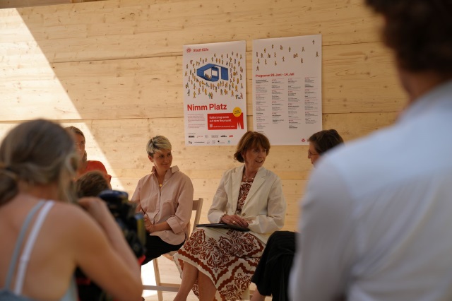 Seit dem 20. Juni 2023 liefen die Aufbauarbeiten auf dem Neumarkt. Zum einen hat die Kölner Künstlerin Erika Hock ihren etwa zehn Meter langen und fünf Meter breiten, überdachten Pavillon installiert, welcher in den kommenden Wochen der Ankerort des "Nimm Platz"-Kulturprogramms werden soll. Zudem hat das "Photobookmuseum" die Open-Air-Ausstellung "Mittendrin" mit Fotografien des Kölner Künstlers Wolfgang Zurborn auf den Freizeit- und Konsumlandschaften der 1980er und 1990er Jahre großformatig an den Bauzäunen am Neumarkt angebracht und diese dadurch in Ausstellungsflächen verwandelt.
