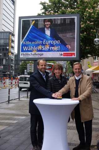 Ein großformatiges Bekenntnis für Europa: Oberbürgermeisterin Henriette Reker und Alexander Stotz, CEO Ströer Media Deutschland GmbH, haben bei einem Pressetermin am heutigen Mittwoch, 8. Mai 2019, eine Außenwerbekampagne vorgestellt, mit der sich Ströer auf über 100 digitalen Stadtinformationsanlagen in Köln zu Europa bekennt und die Oberbürgermeisterin die Kölner Wahlberechtigten aufruft, die von ihr ausgerufene #kölnchallenge zu unterstützen. Das gemeinsame Ziel beider Kampagnen ist eine hohe Wahlbeteiligung bei der Europawahl. Â