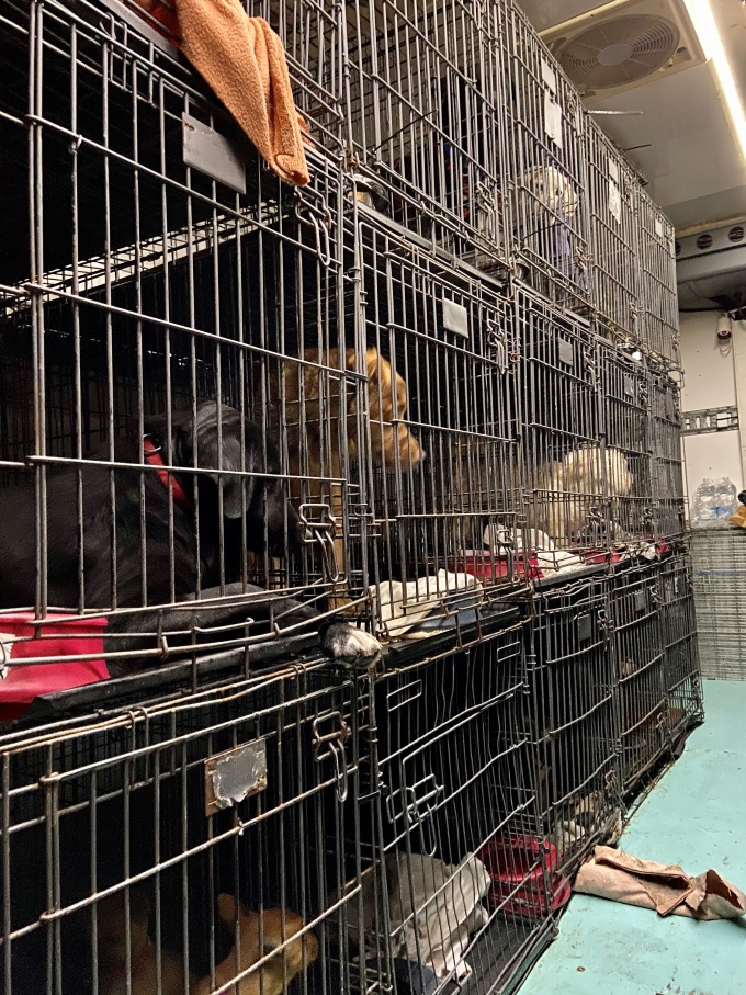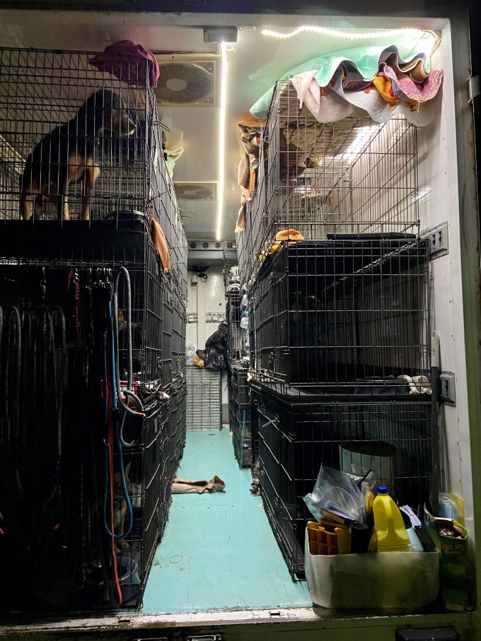 Zwei Fahrer hatten den Kleintransporter, der wegen entsprechender Werbeaufschriften auch nach außen hin als Hundetransport erkennbar war, gelenkt. In der geschlossenen Ladefläche von knapp zehn Quadratmetern wurden links wie rechts an den Seiten 52 Hunde und sechs Katzen in rund 30 Käfigen und mehreren Boxen gehalten. Die Käfige stapelten sich auf beiden Seiten in drei Reihen übereinander, teilweise befand sich mehr als ein Hund in einem Käfig. Es roch stark nach Urin, die Tiere waren verängstigt und gestresst. Nicht in allen Käfigen war ausreichend Wasser und Futter vorhanden. Außerdem herrschte eine große Wärme im Inneren des Laderaums. Eine ausreichende Überwachung des Vitalzustandes der Tiere während des Transportes war nicht gewährleistet. Wegen dieser Feststellungen alarmierte der Ordnungsdienst das Umweltamt. Dort war der Transport nicht angemeldet.