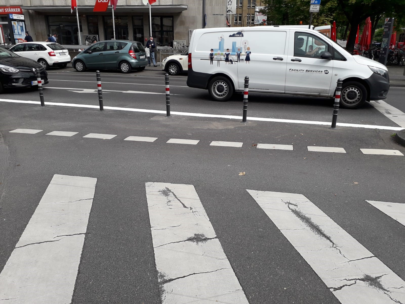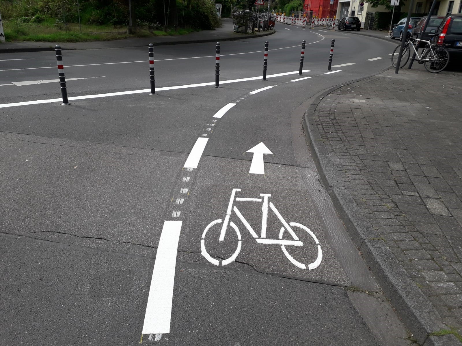 Der freilaufende Rechtsabbieger im Bereich Venloer Straße / Ludolf-Camphausen-Straße am Hans-Böckler-Platz ist "abgepollert". Das Rechtsabbiegen von der Venloer Straße in die Ludolf-Camphausen-Straße ist ab sofort über die Geradeausspur und die entsprechende Ampelanlage möglich. So wird kurzfristig die Sicherheit von Radfahrer*innen und Fußgänger*innen erhöht.