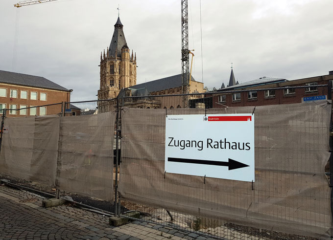 Seit 10. Januar 2018 ist der bisherige Haupteingang am Rathausplatz für Besucher*innen gesperrt. Grund sind Bauarbeiten für das "MiQua. LVR-Jüdisches Museum im Archäologischen Quartier Köln". Eine gut sichtbare Beschilderung weist Besucher*innen des Rathauses den Weg zum vorübergehenden Eingang.
