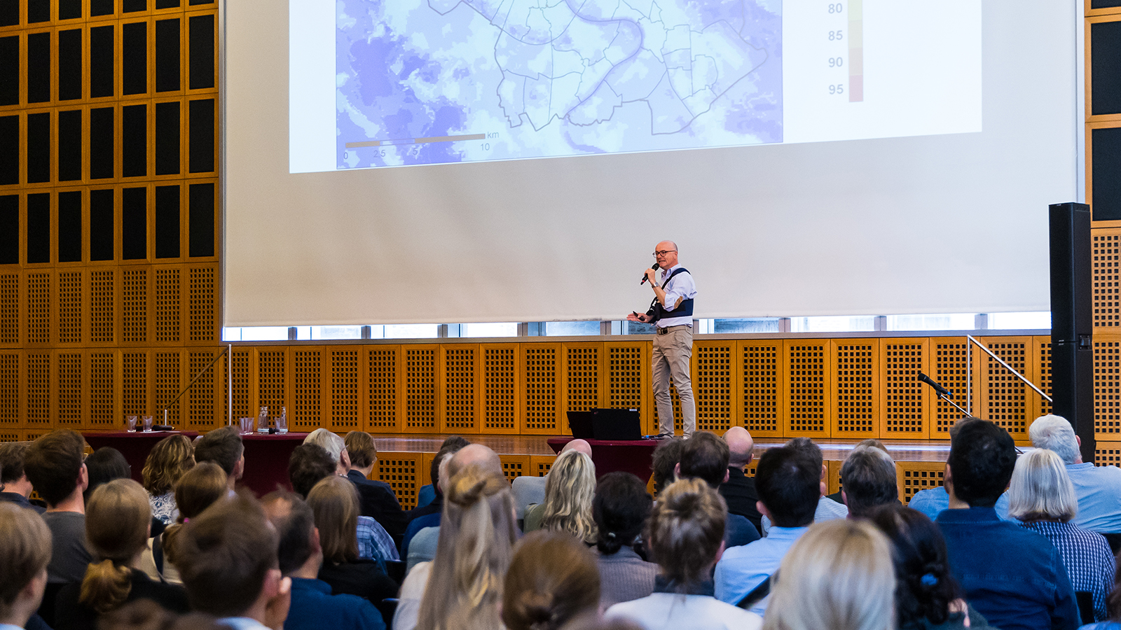 Dass das Thema "Klimawandelanpassung" viele Menschen in Köln bewegt, zeigte sich auf den ersten Blick im gut gefüllten Stiftersaal des Wallraf-Richartz-Museums: rund 170 Gäste hatten sich eingefunden. Das Publikum aus Planer*innen, Architekt*innen, Verwaltungsmitarbeiter*innen, Vertreter*innen der Stadtpolitik und interessierten Bürgern*innen wurde diesmal durch zahlreiche Kölner Klimaaktivist*innen bereichert. Dazu haben sicher auch die hochkarätigen Referenten beigetragen: