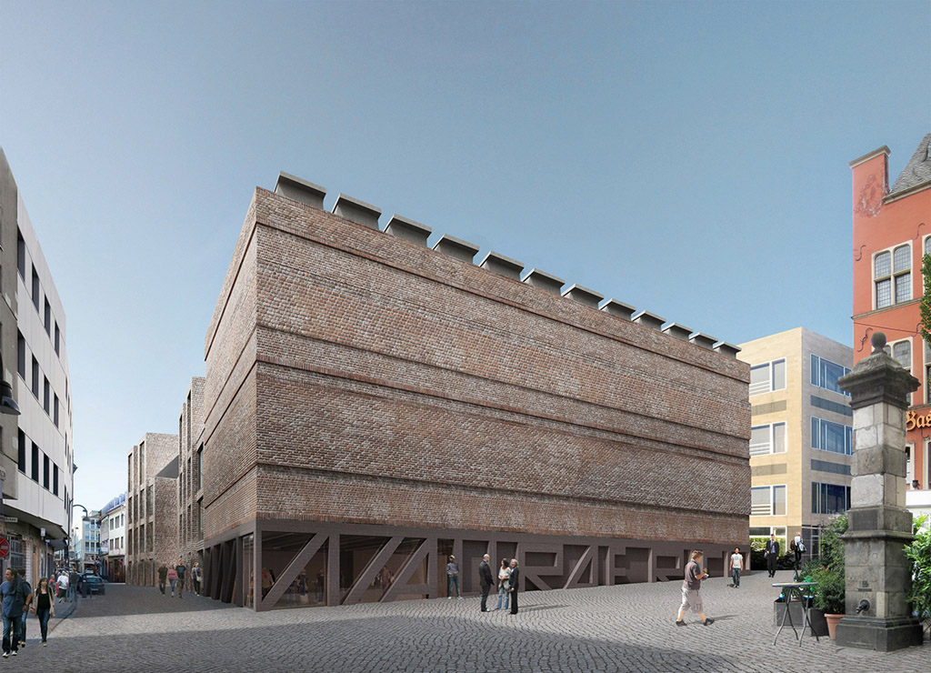 Mit dem Museumsbau werden sowohl der Rathausplatz wie auch die einmündenden Gassen in ihrem historischen Maßstab wieder hergestellt. Ursprünglich als zwei Museen geplant, haben sich die Archäologische Zone und das Jüdische Museum im Verlauf der Planungen konzeptionell angenähert. Die strikte Trennung ist mit gemeinsamer Erschließung und einem großen Rundweg aufgehoben. Dieser leitet die Besucher*innen zunächst hoch in die erste Ebene des Jüdischen Museums, dessen Ausstellungsräume um die Lufträume über Synagoge und Mikwe organisiert sind. Etliche Meter tiefer, und damit unter Straßenniveau, führt der 600 Meter lange Parcours über Wege und Stege durch die Zeugnisse der Spätantike, der Römerzeit und des Mittelalters zurück ins Heute.