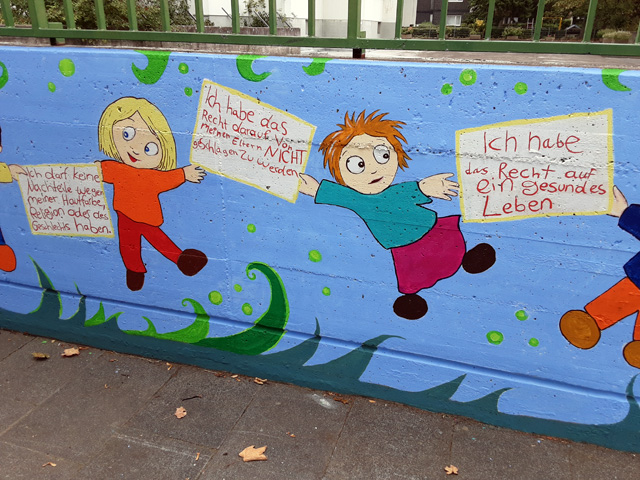 Das Projekt "Dein Bild – Euer Recht" des Bau- und Abenteuerspielplatzes "Der Bau" stellte das Thema "Kinderrechte" in den Fokus. Zusammen mit Kindern und Jugendlichen sowie weiteren Interessierten aus dem Sozialraum wurden im August 2020 zunächst über die sozialen Medien verschiedene Kinderrechte vorgestellt. In Zusammenarbeit von 21 Kindern und Jugendlichen im Alter von 5 bis 15 wurden in den darauffolgenden zwei Wochen unter Anleitung einer Künstlerin und Mitarbeiter*innen der Einrichtung die selbstständig ausgewählten Kinderrechte besprochen und bildlich dargestellt. Die fertigen Werke wurden zunächst im Eingangsbereich der Einrichtung ausgestellt.