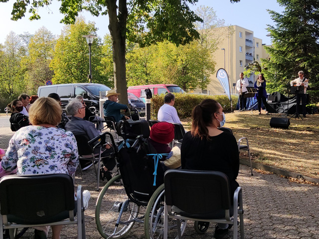 Konzert im Freien vor sitzenden Senior*innen