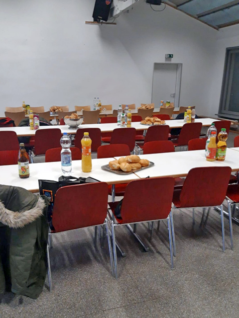 Mit Speis und Trank gedeckte Tischreihen für das Nachbarschaftscafé