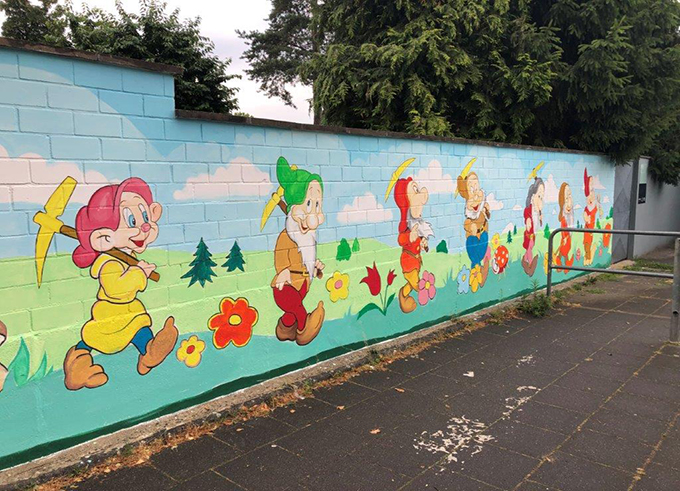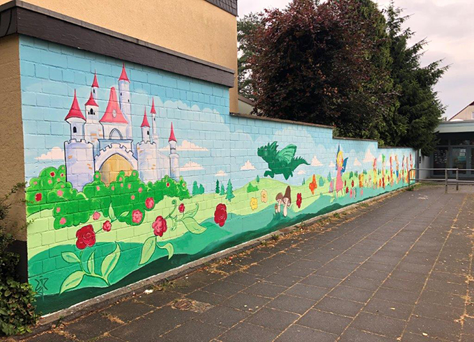 Die Mauer an der Kindertagesstätte Unnauer Weg ist als Fortsetzung zur Bolzplatzwandbemalung von Kindern aus Lindweiler gemeinsam mit einer Künstlerin gestaltet worden.