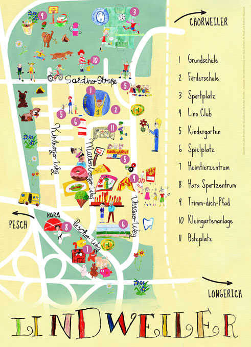 Zu Beginn wurden alle Kinder der Schule befragt, welche Plätze, Orte, Wege, Gebäude, Geschäfte des Stadtteils für sie eine wichtige Bedeutung haben. Diese Punkte wurden mit den Schüler*innen aufgesucht und fotografiert. Aus jeder Klasse kamen 10 Kinder zusammen, die anhand der Fotos und weiterer Vorlagen einen ganzen Vormittag gezeichnet und gemalt haben. Gemeinsam wurde vermerkt, wo die Illustrationen auf dem Plan ihren Platz finden sollten. Die Zeichnungen wurden von einer Grafikerin abschließend zu einem Plakat gestaltet.