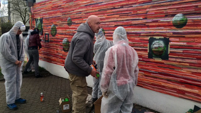 Die Garagenwand am Kirchplatz wurde in einer Gemeinschaftsaktion der Eigentümergemeinschaft, des Lino-Clubs, der GAG AG und der katholischen Pfarrgemeinde Sankt Dionysius aufgewertet. Die Eigentümer*innen haben umfangreiche Vorarbeiten übernommen. Anschließend hat das Künstlerteam Goodlack die unansehnliche Mauer unter Beteiligung von Kindern und Jugendlichen aus dem Stadtteil in ein fröhlich buntes Comic verwandelt.