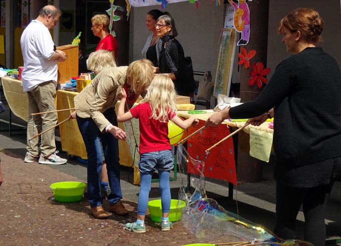 Mit der Aktion beim Stadtteilfest sollten mehrere Generationen, Jung und Alt, Familien mit ihren Kindern und verschiedene Nationalitäten zum gemeinsamen Kicken und Anfeuern angeregt werden.