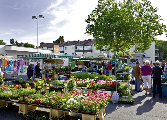 Auf dem Markt in Köln-Flittard sind donnerstags mehrere freie Marktstände zu vergeben. Insbesondere ist der Lebensmittelhandel – vorzugsweise Käse und Fisch– noch unterpräsentiert.